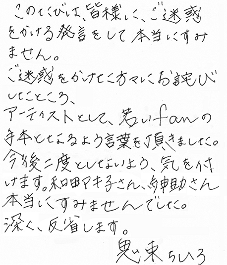 鬼束が直筆謝罪文「和田アキ子さん、紳助さんすみません」本人にも詫びた