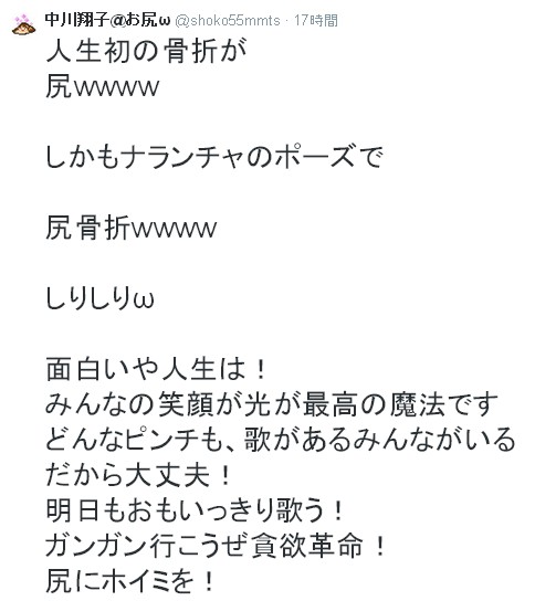 中川翔子 「ジョジョ立ち」ナランチャのポーズで尾骨骨折