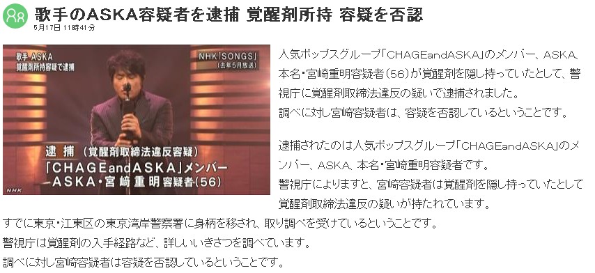 本日の記事は「ASKA容疑者を覚醒剤所持容疑で逮捕 」です。