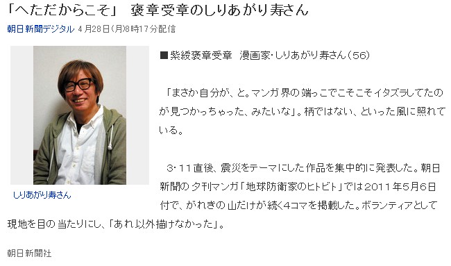 本日の記事は「しりあがり寿が紫綬褒章を受章」です。