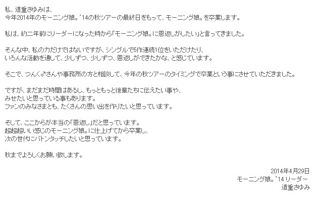 モーニング娘。'14の道重さゆみが今年の秋にグループおよびハロー!プロジェクトを卒業することが明らかになりました。