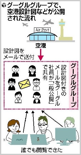 メール共有サービス「グーグルグループ」で空港や駅の設計図などをグーグル日本法人が流出させていた問題で、地図やメールのやりとりを公開状態にしていた交通施設や商業施設は130か所以上になることがわかりました。