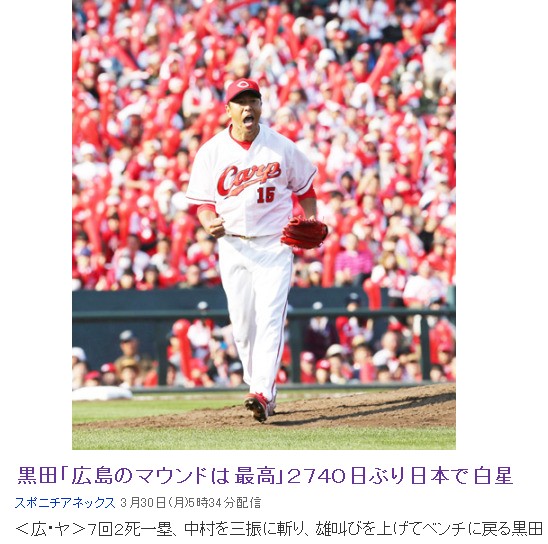 本日の記事は「広島・黒田博樹、2740日ぶり日本で白星」です。