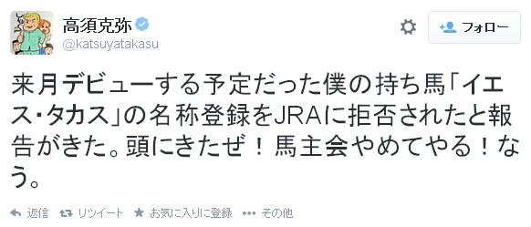 美容外科「高須クリニック」の高須克弥院長が、来月デビュー予定だった自身所有の競走馬を「イエス・タカス」「イエスイエスタカス」「イエスタカスイエス」という名称で登録しようとしたところ、日本中央競馬会(JRA)に拒否されたとして「馬主会やめてやる!」と自身のTwitterで怒りをあらわにしました。