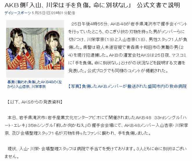 本日の記事は「AKB握手会に刃物男、川栄と入山が負傷」です。
