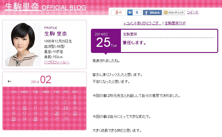 本日の記事は「乃木坂46・生駒里奈、AKB48チームB兼任」です。